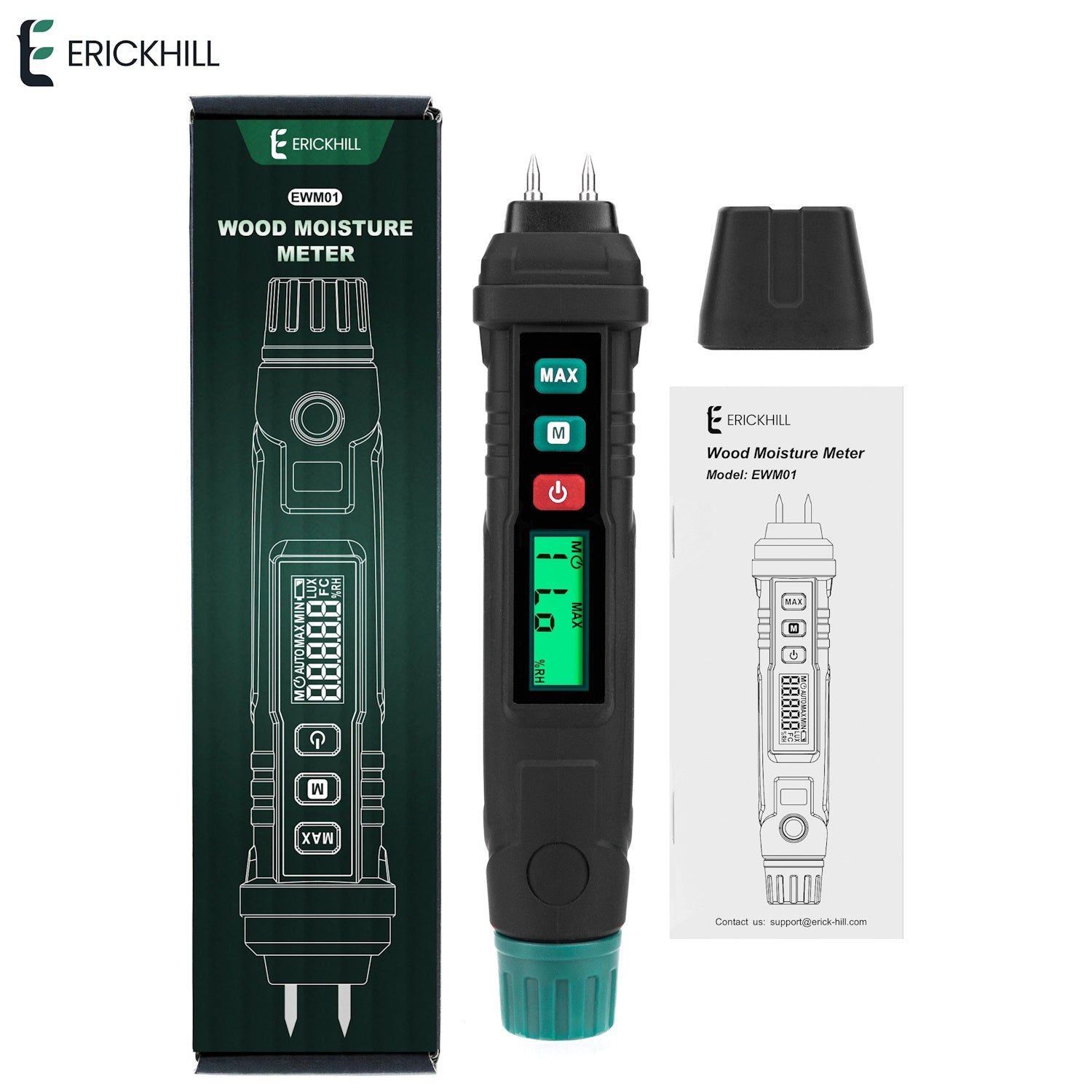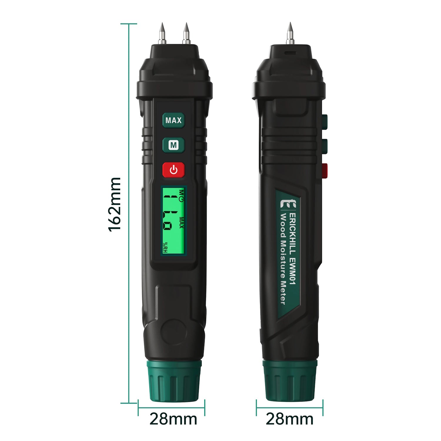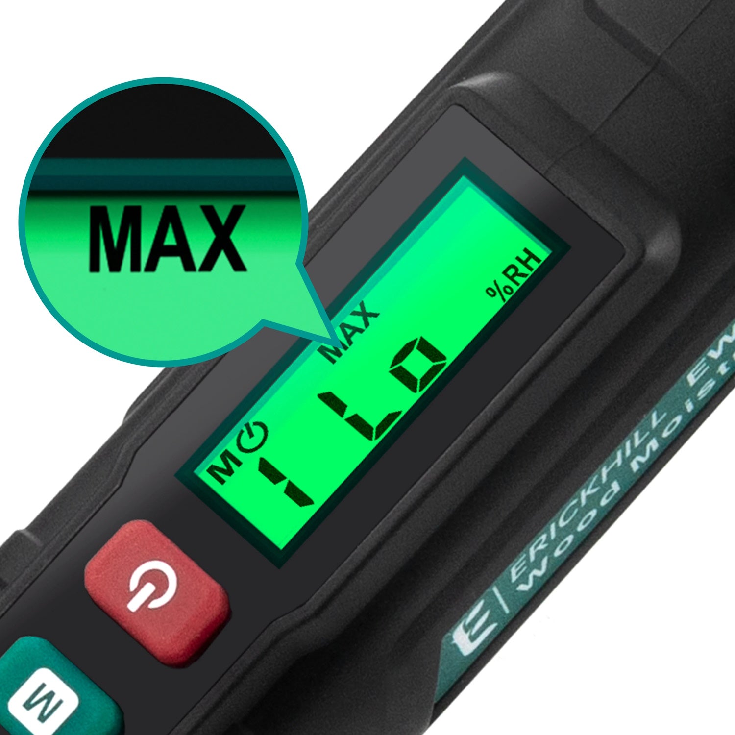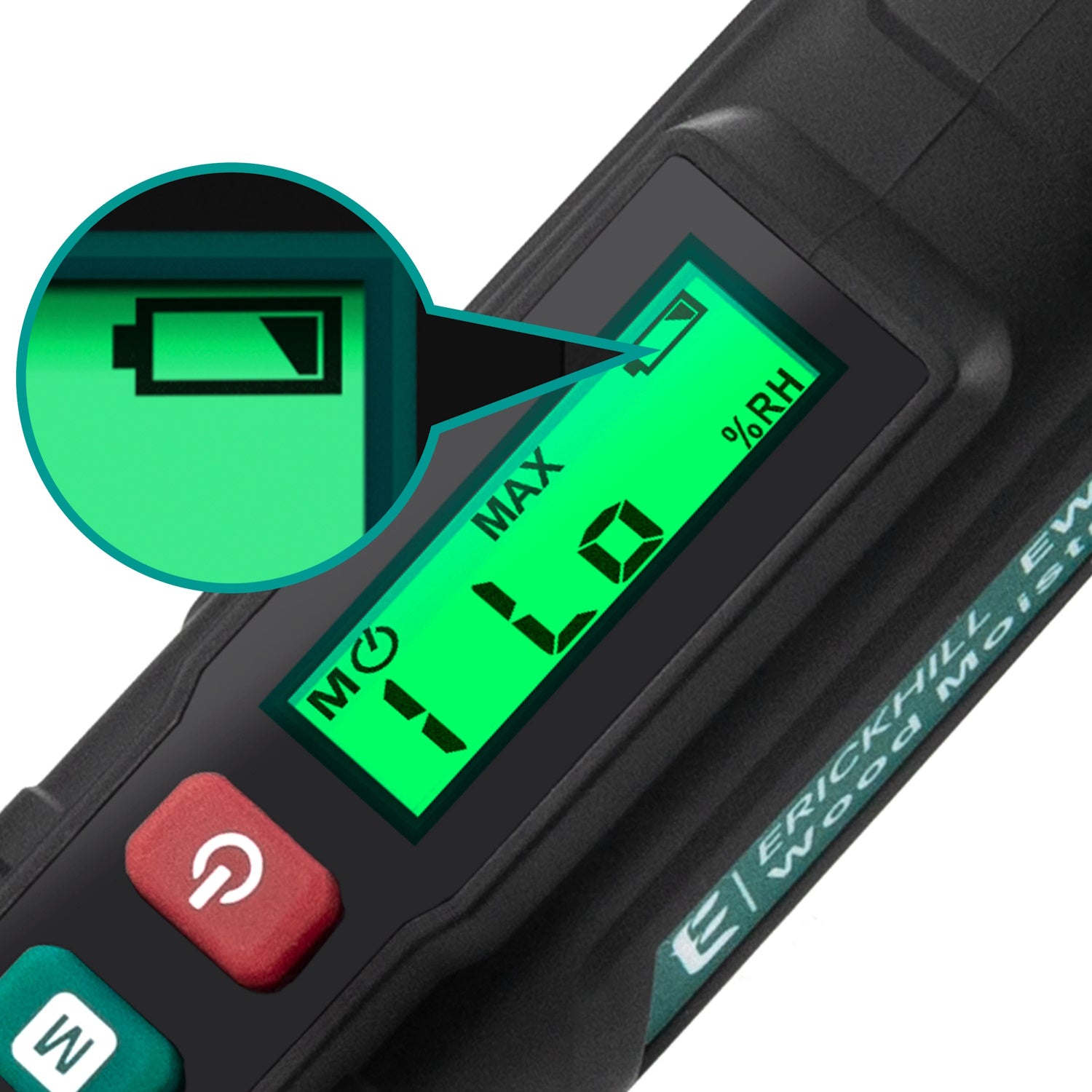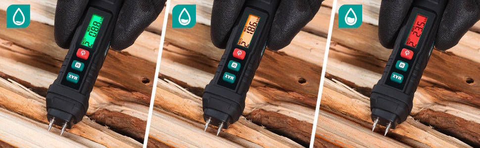 The three-color backlight (red/orange/green) indicates high, medium, and low moisture content, allowing quick and accurate identification of dampness. The ERICKHILL moisture meter is the ideal tool for pinpointing areas of moisture buildup.