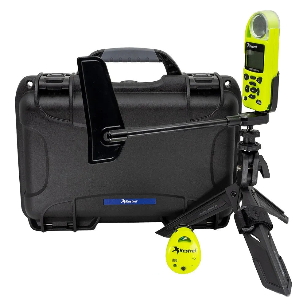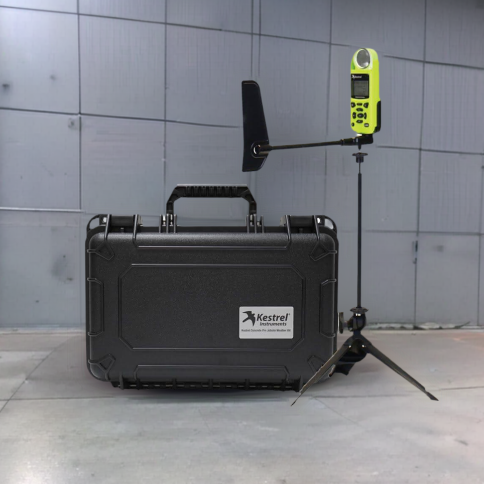 Das Kestrel Concrete Pro Jobsite Weather Kit umfasst das Kestrel 5200 Professional Environmental Meter mit LiNK, eine drehbare Windfahnenhalterung und ein tragbares Mini-Stativ mit Verlängerungsstange.