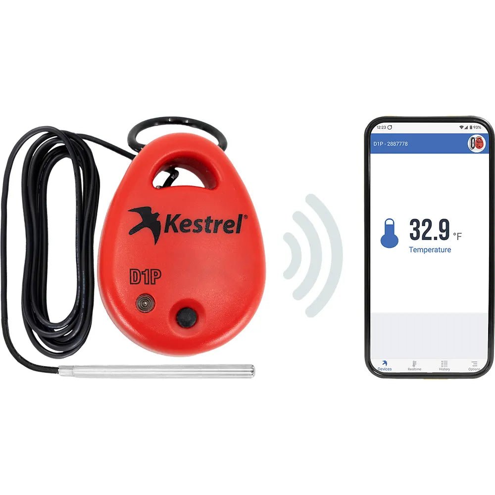 Rastree y registre sin esfuerzo las condiciones de temperatura en líquidos, suelo o áreas de difícil acceso con el duradero y confiable Kestrel DROP con Sonda D1P.