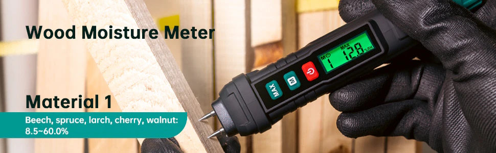 Цей вологомір ERICKHILL має два режими, що дозволяє знімати показання як з деревини, так і з інших будівельних матеріалів. Він пропонує сім каліброваних шкал для забезпечення точних показань, з двома металевими наконечниками з високою чутливістю для вищої точності.